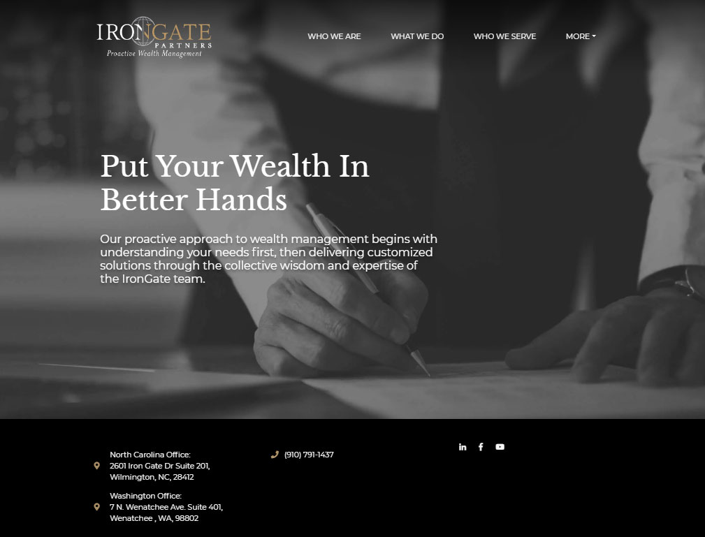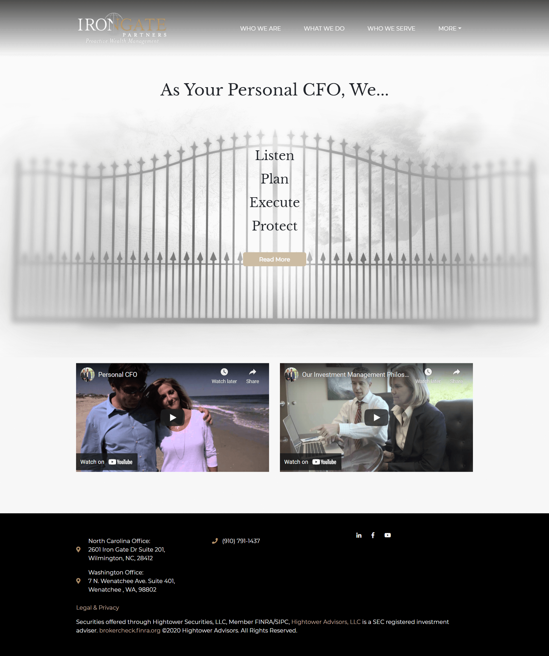 Interactive elements – sticky top gradient navigation, parallax scrolling, video hero